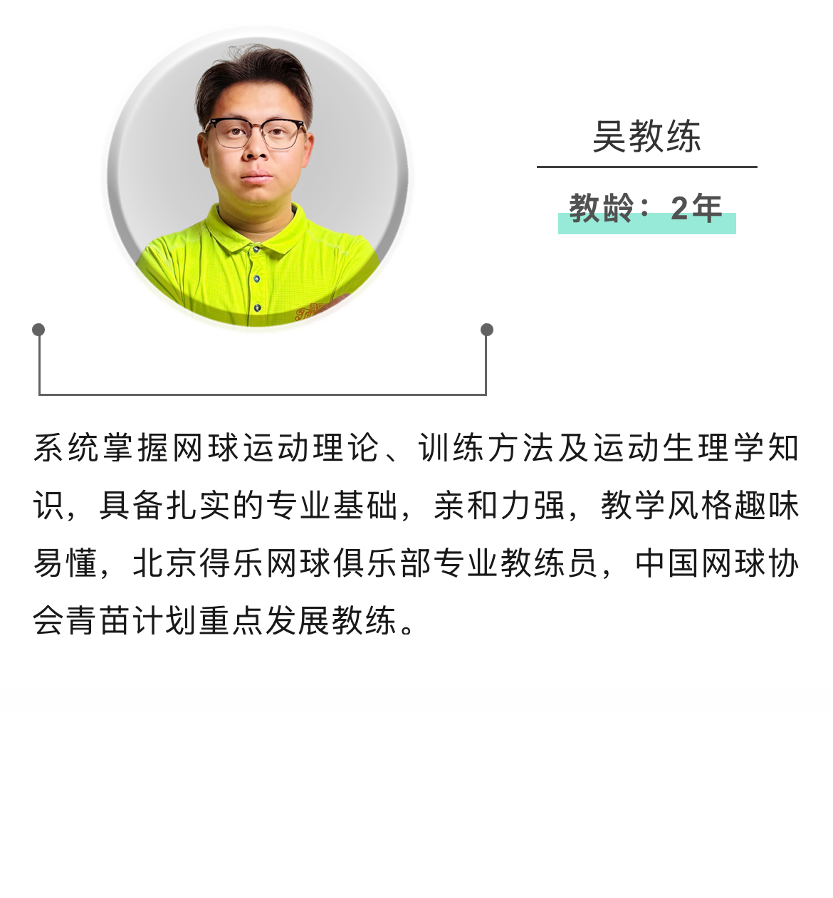 得乐网球俱乐部拥有一支专业网球教练团队,全部为大学本科及以上学历,拥有各级教练资格,包括ITF、USPTA、PTR、中国网球协会认证教练、短式网球教练、快易网球教练等等,每周得乐网球俱乐部内部有专业化教练培训,把先进、科学、优雅的网球运动分享给每一位学员,普及网球运动的同时、培养国家后备体育人才!